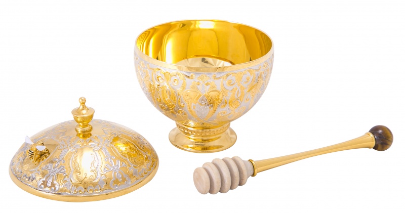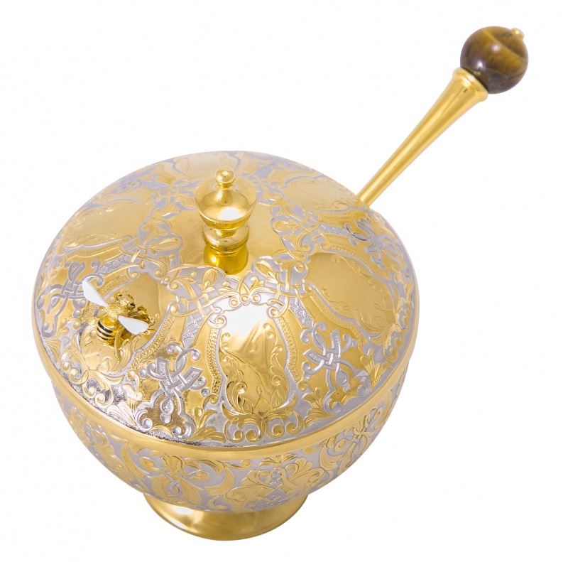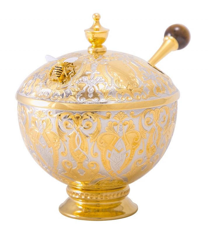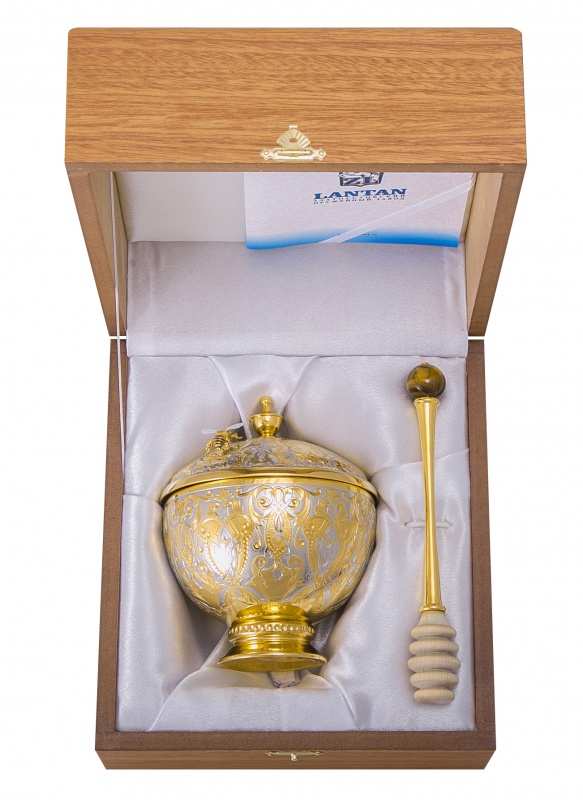 Незаурядным подарком для ценителей эксклюзива наверняка станет компактная медовница. Такая разновидность посуды редко встречаются в розничной торговле, однако она, как ничто другое, подходит на роль изысканного презента для дорогого человека. Изделие выполняется из латуни, с покрытием золотом и никелем. Лаконичная форма дополняется вензелями ручной работы, декоративной фигуркой пчелы и специальной ложечкой для черпания меда. Медовница предлагается в подарочной упаковки из ценных пород дерева.