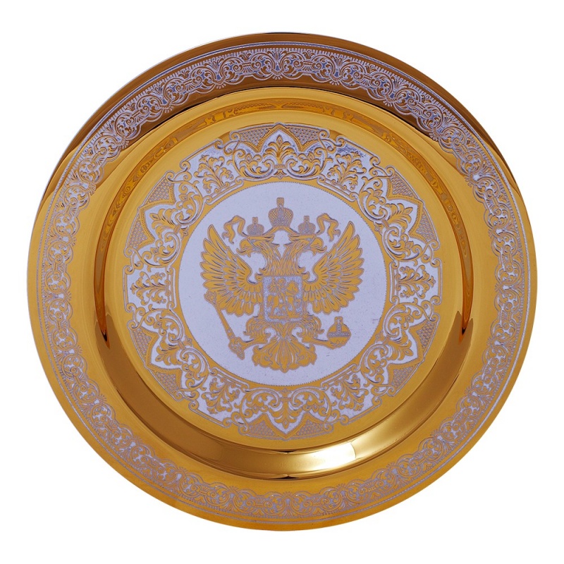Блюдо "герб россии" златоуст. Материал: латунь. Покрытие: золотом 999,9; никелем. Техника исполнения: токарные и слесарные работы, рисовка кистью на металле, многоступенчатая гравировка иглой по лаку, травление, ручная подрезка, полировка. Оригинальное блюдо «Герб России» с символом нашей страны изготовлено из дорогой латуни и покрыто позолотой. Оно украшено многоступенчатой гравировкой и рисовкой кистью. Эксклюзивное изделие ручной работы – элитный подарок для руководителя, делового партнера и VIP-персоны, которое подчеркнет их высокий статус, а также ваш вкус и уважение к одариваемому. Размер: диаметр 280 мм. Покрытие Гальванический метод