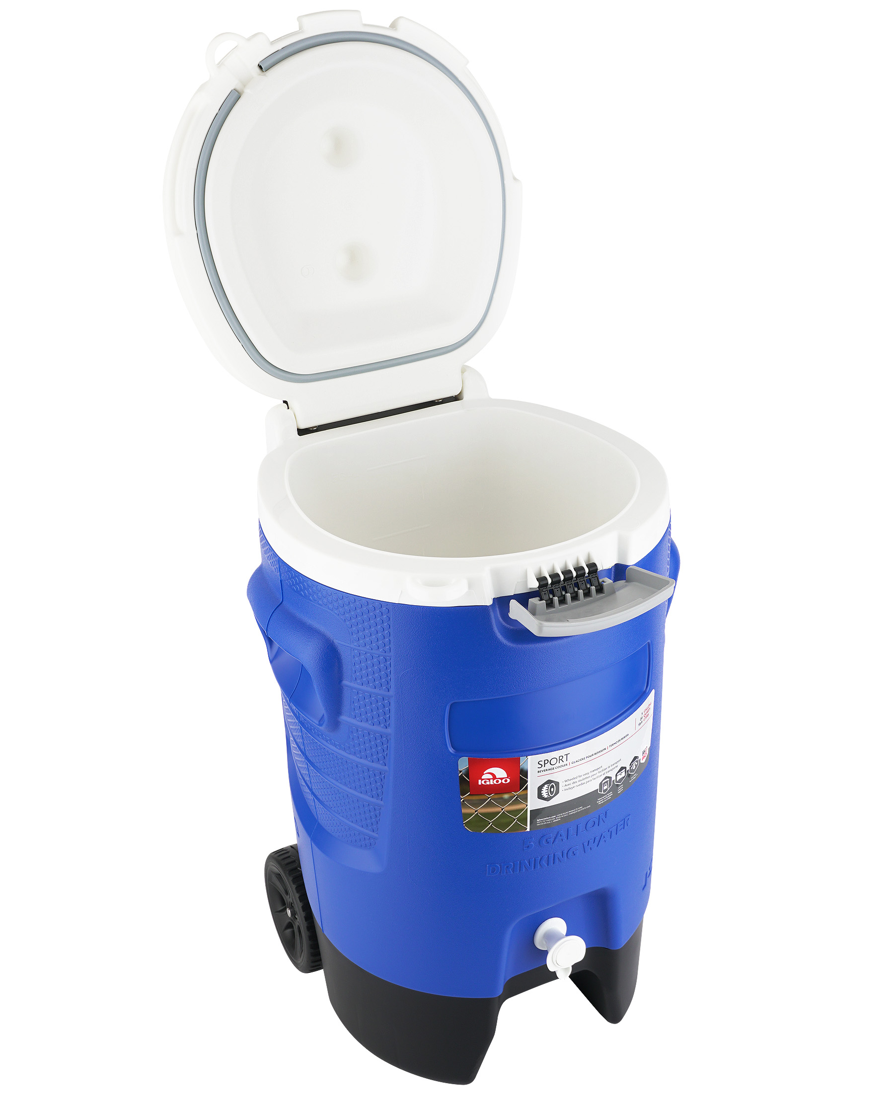 Изотермический контейнер igloo 5 gallon sport. Внутренние размеры: Длина: 22.86 см Ширина: 20.32 см Высота: 33.02 см Внешние размеры: Длина: 37.2 см Ширина: 34.89 см Высота: 54.78 см Объем: 18.9 литров (20 Quarts) Материал корпуса: Ударостойки пластик Материал камеры: Ударостойкий пластик Изоляция: Ultratherm® Ручки: Боковые, литые Петли: Пластиковые, интегрированные в крышку Особенности: Телескопическая ручка, пластиковые колеса Вес: 3.74 кг • Прочный корпус, выполненный из типов пластика, устойчивых к повреждениям и повышенным нагрузкам. • Изоляция Ultratherm® корпуса и крышки. • Пластиковые колеса литой формовки для удобства перемещения практически по любым поверхностям. • Клапан-дозатор кнопочного типа. • Усиленные, эргономичные боковые ручки. • Телескопическая ручка с двумя фиксаторами выбранного положения и мягкой оплеткой ручки в области захвата.. • Особая крышка позволяет сидеть на контейнере. • Cool Riser Technology™ — Дно контейнера обладает особой формой, имитирующей ножки, благодаря такой конструкции исключается контакт с нагретыми поверхностями и осуществляется вентиляция пространства под контейнером, что позволяет сохранять температуру внутри камеры дольше.