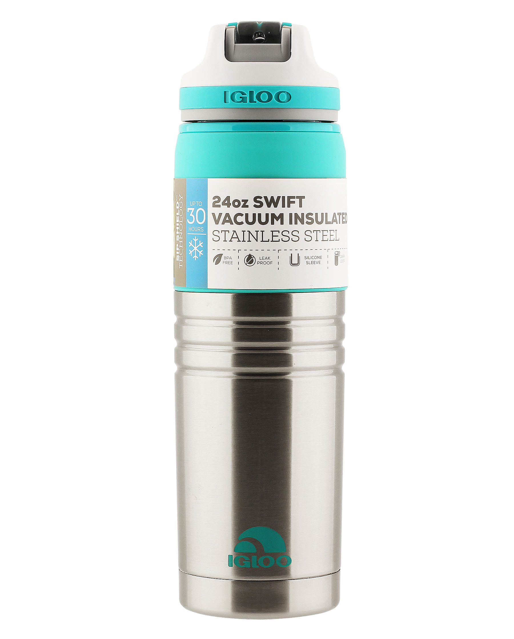 Кружка-термос из нержавеющей стали 700 мл igloo swift 24 aqua. Объем: 700 миллилитров (24 ounces) Материал корпуса: Нержавеющая сталь 18/8 Материал колбы: Нержавеющая сталь 18/8 Пробка: Съемная, пластиковая на резьбе Особенности: Встроенная в крышку петля для переноски в руке Сохраняет горячее: до 8 часов (только теплые напитки для глотков из трубочки) Сохраняет холодное: до 30 часов • Легкая, компактная, герметичная, небьющаяся кружа-термос с двумя стенками из нержавеющей 18/8 стали и вакуумной изоляцией. • Объем 0,7л • Для настольного использования, для занятий спортом, для отдыха на природе, для путешествий на автомобиле. • Пожизненная гарантия изолирующего действия*. • Не использовать в посудомоечной машине (только для мытья руками). • Легкая, компактная, небьющаяся кружа-термос с двумя стенками из нержавеющей стали 18/8 и вакуумной изоляцией • Мягкий силиконовый чехол на корпусе бутылки для удобного захвата рукой • Система поильника с трубочкой позволяет пить на ходу • Технология «SIP SHIELD™» — Особая конструкция откидного поильника с защитной крышкой для гигиеничной эксплуатации • Встроенная в крышку петля для удобства переноски с прорезиненной внутренней частью • Не размещать в СВЧ печи.