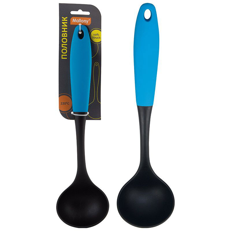 Половник kt-04b. Половник KT-04B размер: 33*9*2,5см материал: нейлон, полипропилен, термопластичная резина Цвет ручки: голубой Ручка половника с покрытием soft touch #40;термопластичная резина #41; не скользит и приятна на ощупь. Половник предназначен для разлива первых жидких блюд или компотов.  развернуть описание ▼