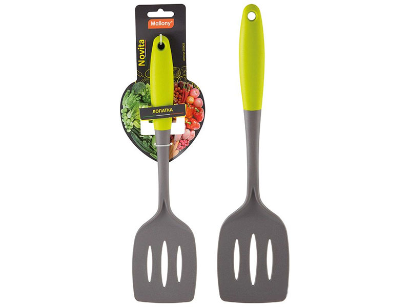 Лопатка novita. Лопатка с отверстиями из нейлона с цветной ручкой из TPR, серия Novita, тм Mallony Цвет ручки - зеленый, цвет рабочей части - серый. Материалы: нейлон, TPR Упаковка: цветная подложка. Предназначена для переворачивания/перемешивания блюд в процессе приготовления.  развернуть описание ▼