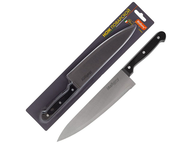 Нож разделочный mal-01cl. Длина лезвия: 20 см Толщина стали: 1,5 мм Пластиковая рукоятка Материал: нержавеющая сталь, пластмасса Упаковка: одинарный блистер