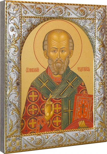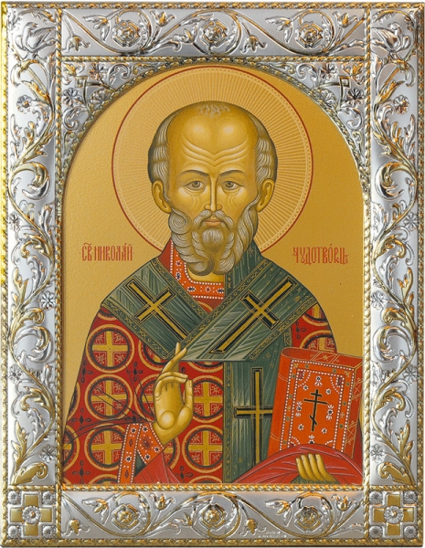 .николай чудотворец, архиепископ мир ликийских, святитель, икона в посереб. Рамка икон выполнена из металла, покрытого серебром. На окладе имеется штамп по европейскому стандарту. Каждое изделие изготавливается с использованием традиционной ручной обработки с использованием драгоценных металлов и высококачественных материалов, полученных по новейшим технологиям. MIRO SILVER- это новый металл, который придает покрытию поверхностную обработку, включающую в себя и большую стойкость к окисляющему слою чистого серебра 999,95%, по сравнению с обычными покрытиями. Иконография выполнена минеральными красками по золочению методом UV печати на деревянной доске или МДФ.