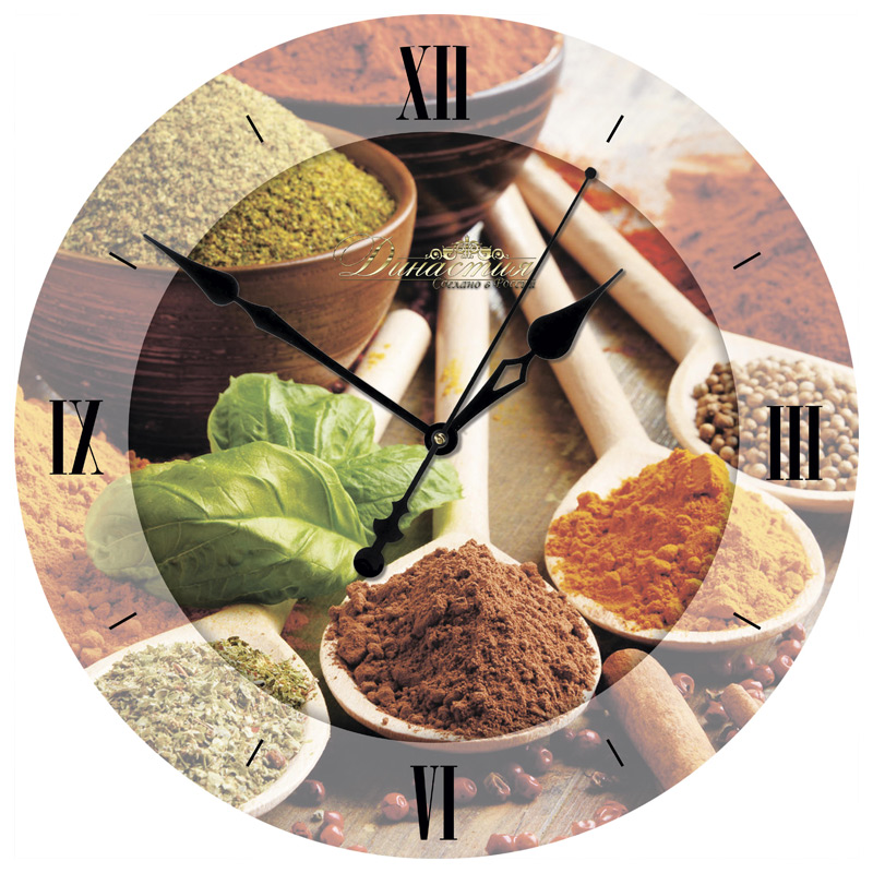 Корпус: из стекла, декорирован изображением специй. Циферблат черного цвета с открытыми фигурными стрелками черного цвета