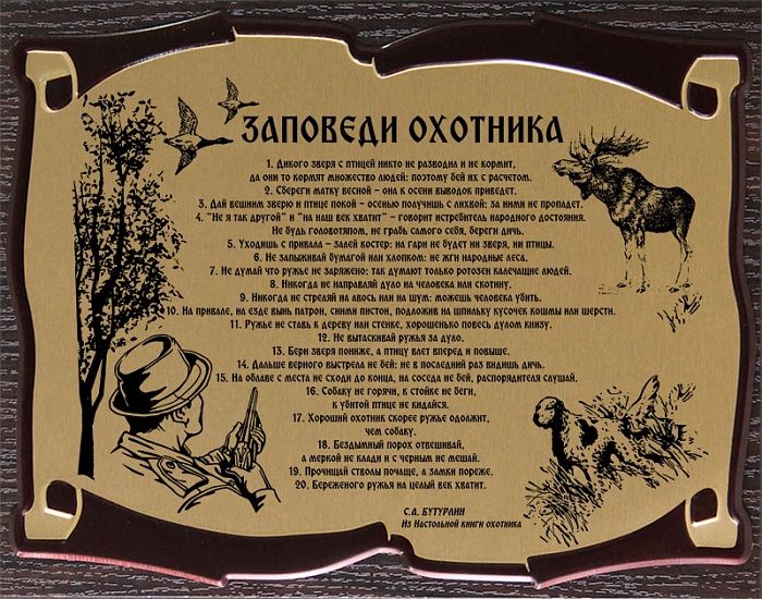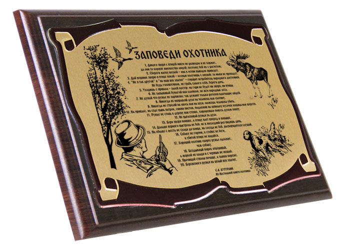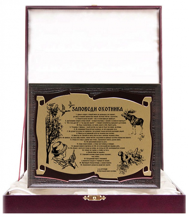 Элит плакетка заповеди охотника зол.сублимация. Код товара: 010306009 Основной материал: МДФ, металл Размер: 26*20 Детали: упаковка: подарочный футляр с шелковым ложементом