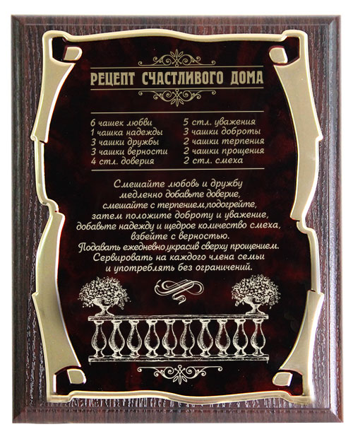 Плакетка рецепт счастливого дома золотая серия. Код товара: 010310116 Основной материал: МДФ, металл, упаковка из декоративного картона Размер: 26*20см