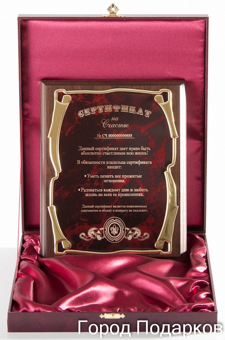 Плакетка сертификат на счастье - золотая серия элит Плакетка сертификат на счастье - золотая серия элит