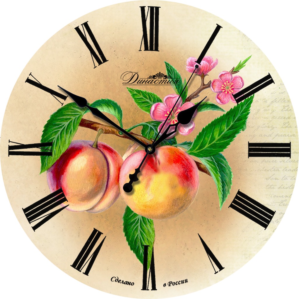 Настенные часы династия 02-011 персики. Настенные часы из дерева Династия 02-011 Персики Настенные часы из дерева Династия 02-011 Персики оснащены надежным кварцевым механизмом с бесшумным плавным ходом секундной стрелки. Корпус из дерева, декорирован изображением сочных персиков. Циферблат открыт. Такие часы отлично подойдут для Вашей кухни. Характеристики часов Династия 02-011 Персики: Производитель: Россия. Гарантия 1 год. Материал: дерево. Открытые стрелки часов. Диаметр: 33 см. Размер, см : 33х33х4 Материал : Дерево Механизм : Кварцевый Функции : Плавный бесшумный ход