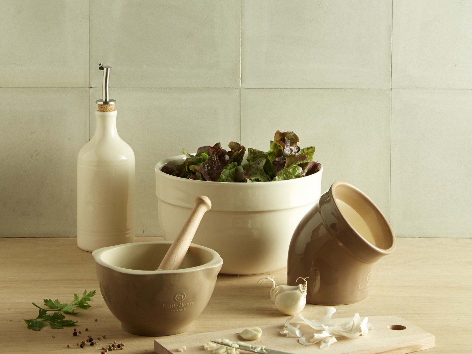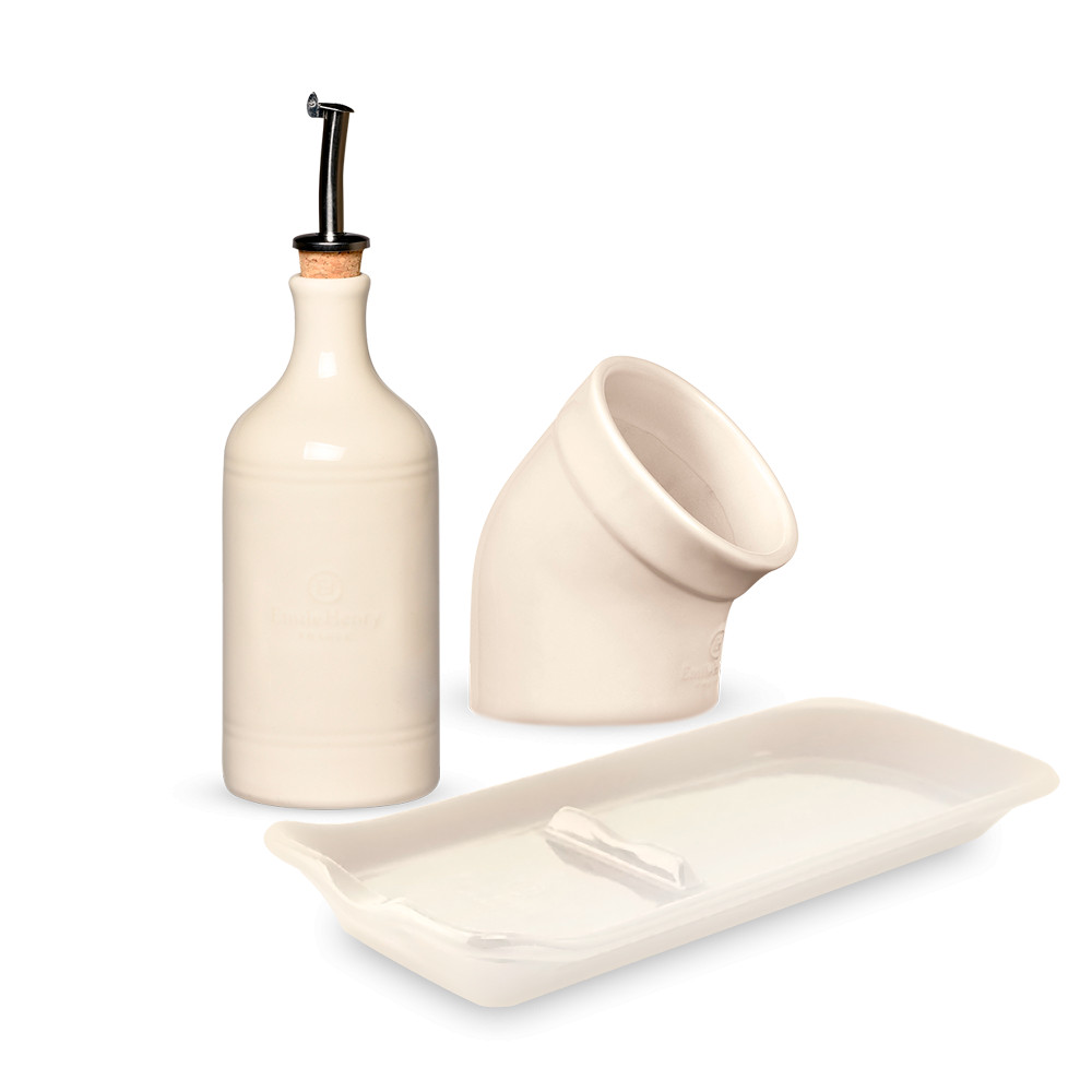 Набор солонка, бутылка д/масла + подставка emile henry в подарок, цвет кре. Бренд: Emile Henry Страна: Франция Описание: В состав набора входит: — Бутылка для масла, объем 450 мл, диаметр 7,5 см, высота 23 см; — Солонка, объем 350 мл, диаметр 10 см, высота 13 см; — Подстака под ложку, размер 22,5 х 10 см.