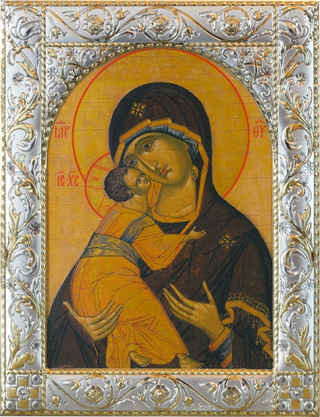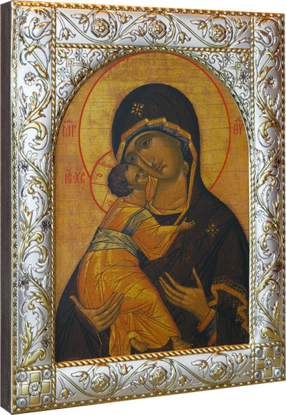 Владимирская икона божией матери, икона  в посеребренной рамке, золочение,.   Рамка икон выполнена из металла, покрытого серебром. На окладе имеется штамп по европейскому стандарту.  Каждое изделие изготавливается с использованием традиционной ручной обработки с использованием драгоценных металлов и высококачественных материалов, полученных по новейшим технологиям.  MIRO SILVER- это новый металл, который придает покрытию поверхностную обработку, включающую в себя и большую стойкость к окисляющему слою чистого серебра 999,95%, по сравнению с обычными покрытиями.  Иконография выполнена минеральными красками по золочению методом UV печати на деревянной доске или МДФ.