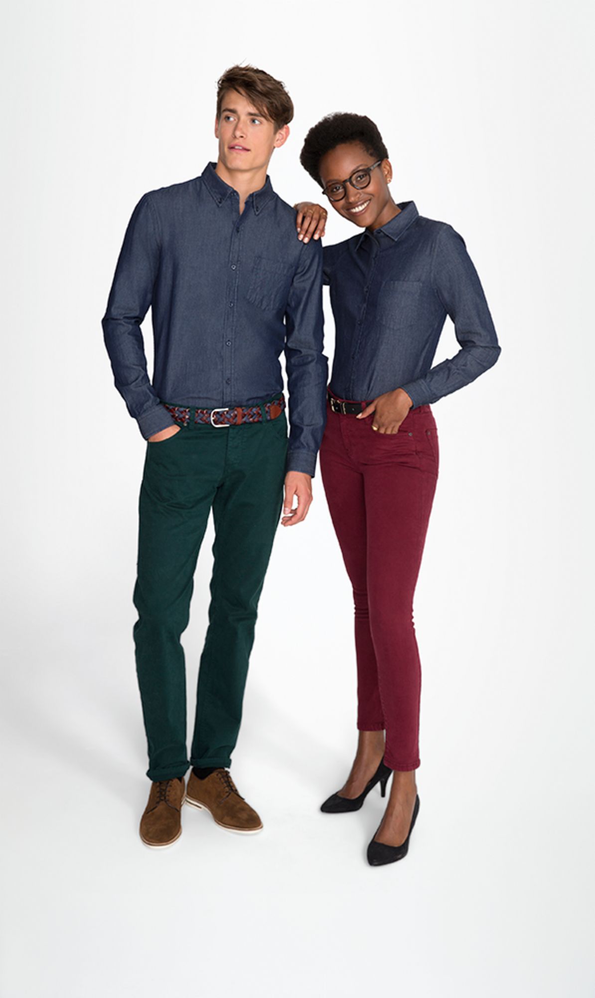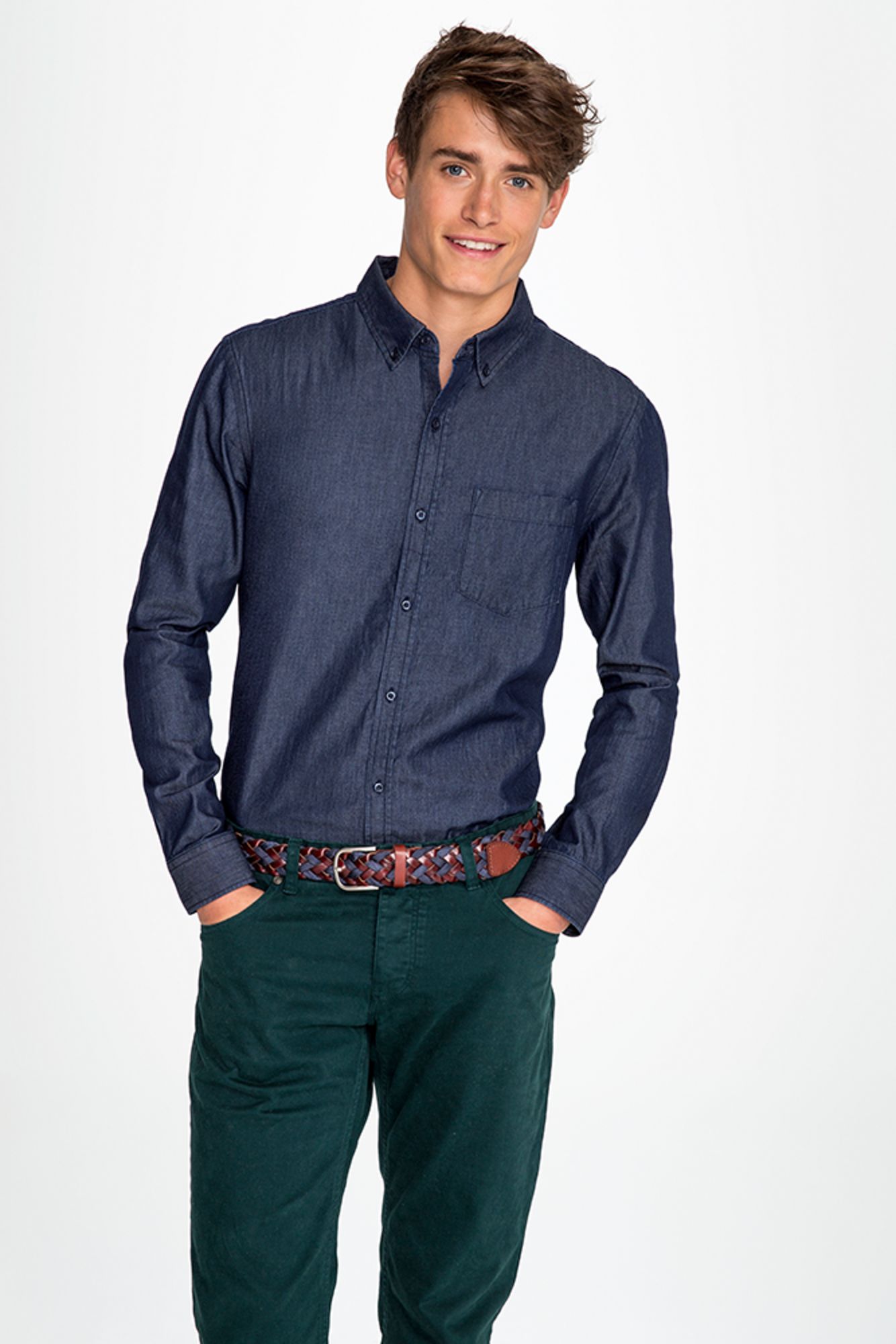 Модель классического кроя из денима с воротником на пуговицах, планкой на 7 пуговиц в тон и манжетами на 1 пуговице.