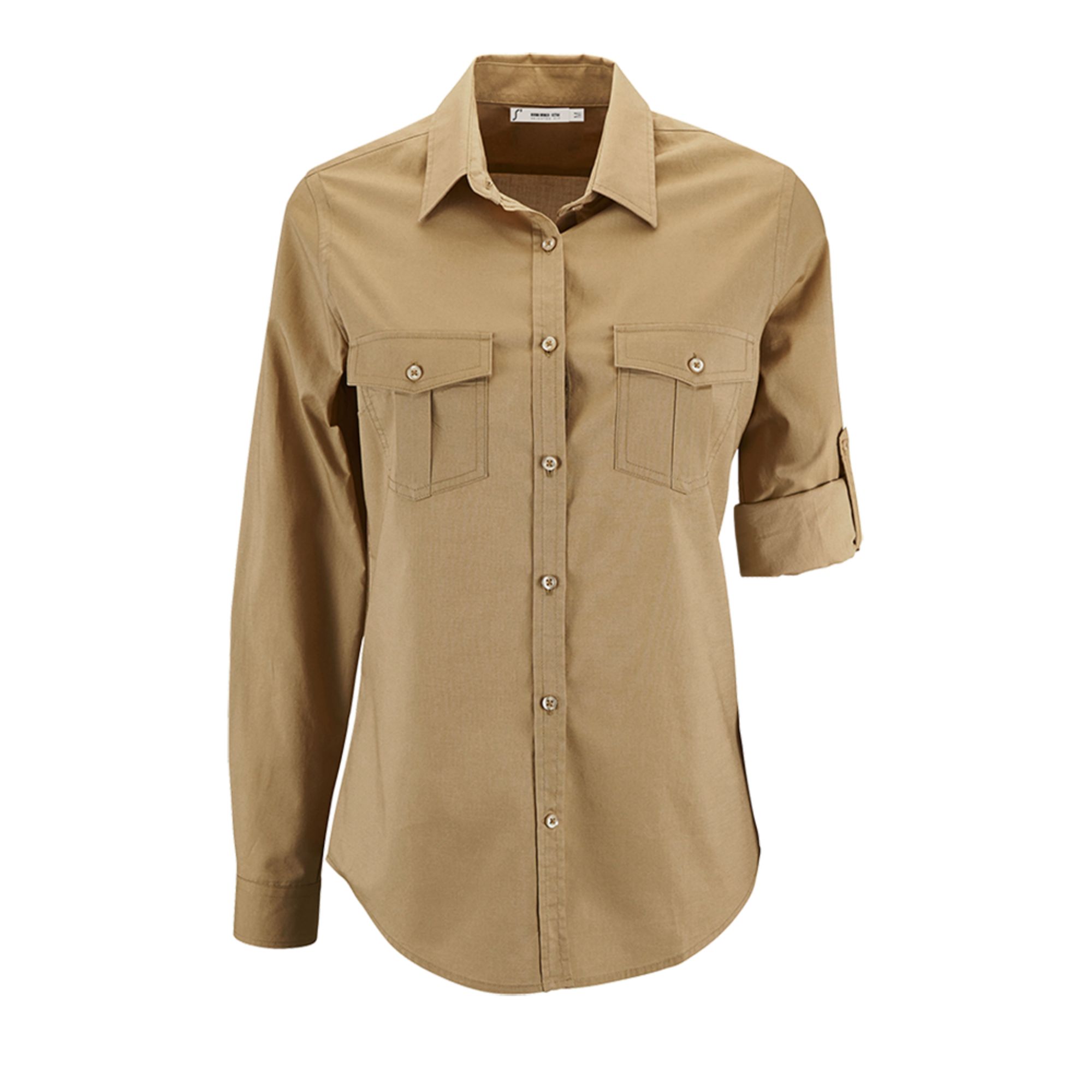 Рубашка женская burma women, бежевая. Pantone ближайший цвет - 7504C Актуально на 12.02.18 Внимание! Код цвета по Pantone приводится справочно, рекомендуем заказать образец Размеры XS–XXL Материал хлопок 100%, плотность 110 г/м; поплин Вес (1 шт.) 355 г SOLS Color Card 111 Транспортная упаковка 55,0x36,0x17,0 см Вес упаковки 7,10 кг Объем упаковки 0,034 м Количество в упаковке 20 шт. Виды нанесения D-Шелкография F1-Флекс (1 цвет) F2-Флекс (1 цвет) IS1-Шеврон с припариванием IS2-Шеврон с пришиванием I-Вышивка Рубашка приталенного кроя в стиле «сафари» с планкой на 7 пуговиц в тон. Манжеты с 1 пуговицей, накладные карманы с клапанами на пуговицах на груди. Горизонтальные и вертикальные вытачки для комфортной посадки. Длина рукава регулируется. Таблица размеров: XS S M L XL XXL 69/44 69/46 70/48 70/50 71/53 71/56