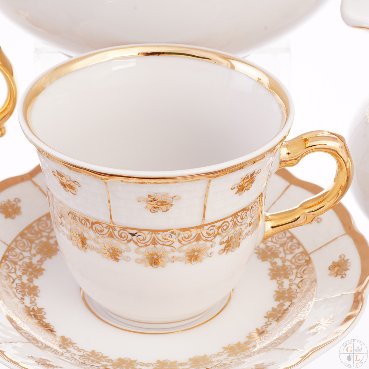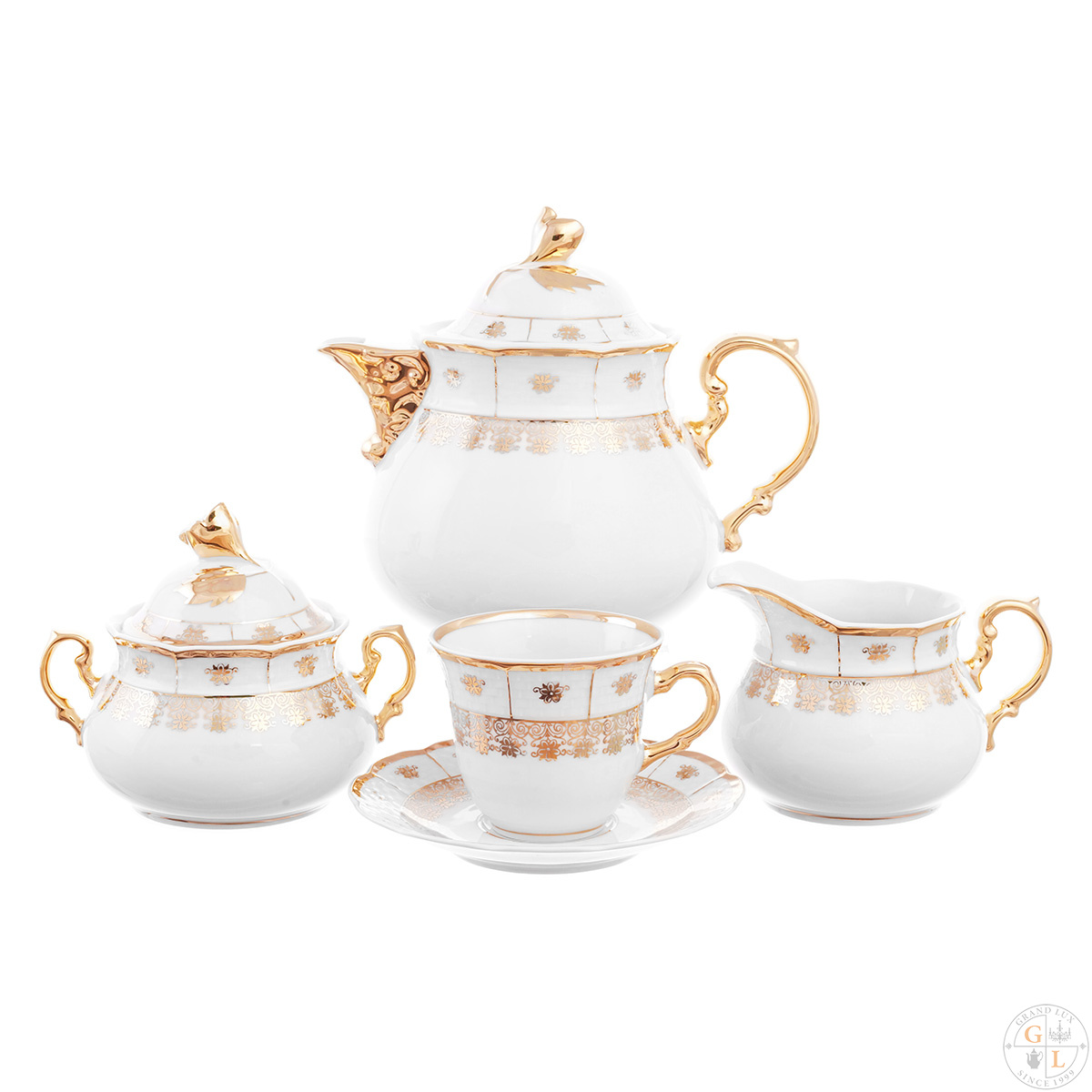 Чайный сервиз thun менуэт золотой орнамент натали 6 персон 17 предметов. Чайный сервиз Thun Менуэт Золотой орнамент Натали 6 персон 17 предметов Менуэт – это грациозный танец. Не менее грациозно, словно в медленном вальсе, застыли в наклоне золотые розы на крышках заварочного чайника и сахарницы из одноименного сервиза. Идеально гладкий глазурованный фарфор, волнистые края изделий и золотой декор – сдержанный и строгий, но от этого не менее торжественный. Если и пить хороший чай, то только из качественной посуды, такой как Thun! Тип товара Чайные сервизы (Чехия, Фарфор, Thun) Страна происхождения Чехия Материал Фарфор Бренд Thun Серия Менуэт Золотой орнамент Назначение Предмет домашнего обихода из фарфора