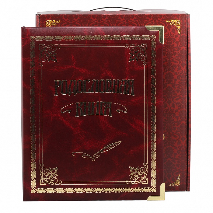 Родословная книга классическая вишневая в картонной коробке. Код товара: 040102001/1 Цвет: бордо с тиснением золотой фольгой Основной материал: кожзам, внутри отделка обложки - декоративный картон Упаковка: картонная коробка Размер: 24,5х31,5х5см Детали: В комплекте руководство по заполнению, диск с видеоуроками и необходимыми программами, подарочный сертификат на бесплатные услуги по оформлению книги