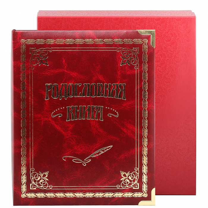 Родословная книга - классическая вишневая в футляре пейсли. Код товара: 040102001/9 Цвет: бордо с золотым рисунком Основной материал: Обложка из искусственной кожи, декоративный картон. Подарочная коробка из дизайнерского картона с шелковым ложементом Детали: В комплекте руководство по заполнению, диск с видеоуроками и необходимыми программами, подарочный сертификат на бесплатные услуги по оформлению книги