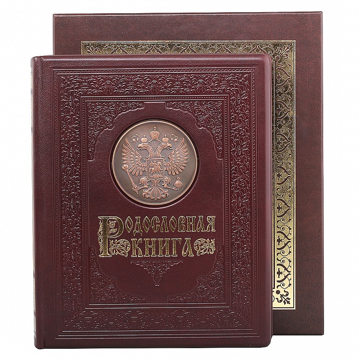 Родословная книга гербовая в футляре(бумвинил с тиснением). Код товара: 040102017/6 Детали: содержит полную инструкцию по заполнению, сертификат с уникальным номером на заказ бесплатных услуг по оформлению книги, два вида основных листов и комплект листов-разделителей