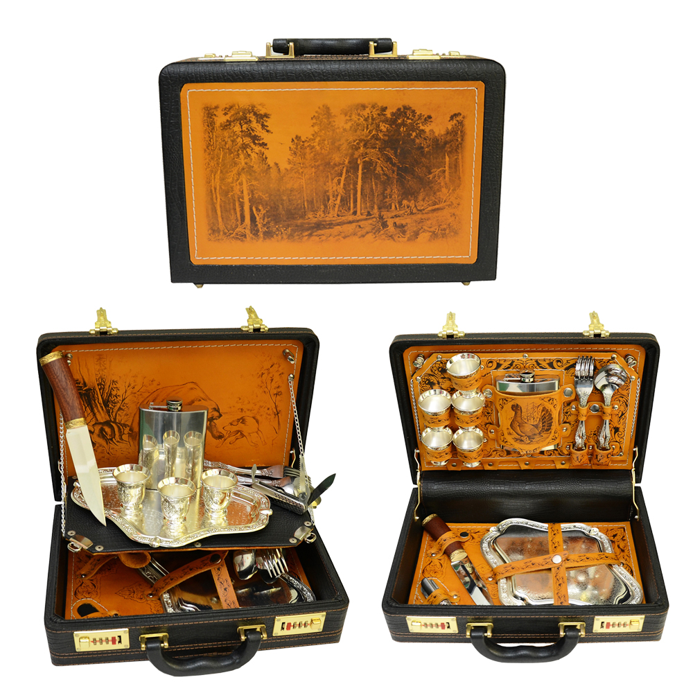 Набор для пикника "подарочный" №4. Код товара: 040505018 Основной материал: кожа, ткань, металл(сталь, нейзильбер) Размер: 28х40х10см Детали: Вес: 3кг