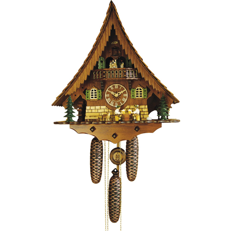 Механические часы с кукушкой sars 0497-90. Часы с кукушкой SARS 0497-90 Часы с кукушкой SARS 0497-90 (Германия) имеют надежный механический немецкий механизм и безупречное качество сборки и производства. - Корпус выполнен из натурального дерева, собран очень качественно опытными мастерами своего дела, декорирован резными элементами тонкой ручной работы и украшен ручной росписью. - Кукушка срабатывает каждый полный час, кукует по количеству часов и каждый час проигрывает мелодия, а также движутся фигурки сверху,а снизу мужики поднимают и опускают кружки пива. - Ручное отключение мелодии и кукования. - Оригинальность этих настенных часов с кукушкой SARS подчеркивают вращающиеся при срабатывании кукушки фигурки сверху танцуют по кругу. Компания SARS воплощает воспоминание многих людей о счастливом детстве, бабушкиных сказках и уютных посиделках в кругу семьи. Характеристики SARS 0497-90: Дополнительные функции - кукушка срабатывает каждый час, мелодия и двигаются фигуркиМеханизм - механический (Германия)Производство- ГерманияРазмер- 46х43х22 смВысота без учета шишек 46 смКорпус - деревоМелодия - естьЗапас хода на 8 днейРучное отключение мелодии и кукования История компании SARS Компания была основана 13 мая 1943 в городе San Juan de Vilasar, Испания. Ранее планировалось совместное участие Швейцарского капитала, но из-за событий Второй Мировой Войны производство началось в 1945 году при полном финансировании Испанской стороной при участии Banco Hispano Colonial de Barcelona. В 1946 году была продана первая партия часов. В 1953 году в соответствии с новыми законами, предприятие было перерегистрировано как ldquo;Sociedad An Размер, см : 46х43х22 Цвет : Темный орех Материал : Дерево Механизм : Механический (Германия) Функции : Завод на 8 дней, двигающиеся фигурки СКИДКИ : Индивидуальные
