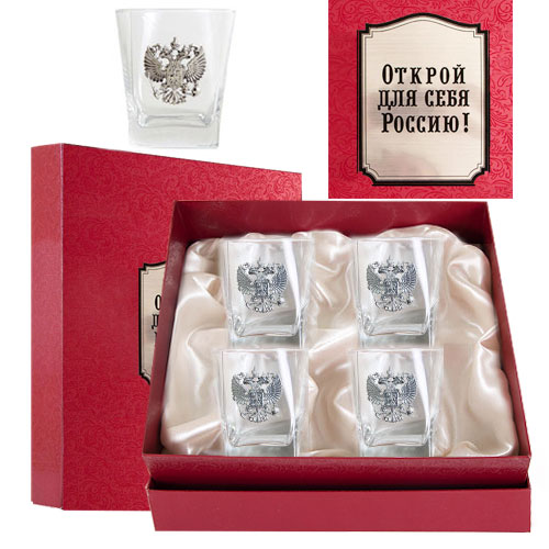 Набор 4 бокала герб к/к красный открой для себя россию. Код товара: 050202003 Основной материал: стекло, олово, подарочная коробка из картона с шелковым ложементом Размер: Упаковка: 26*26*10 см Детали: в наборе четыре бокала для виски