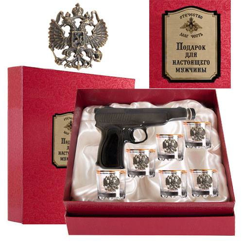 Набор штоф пистолет 6 стопок(низкие, золотая кайма) герб(латунь) к/к отече