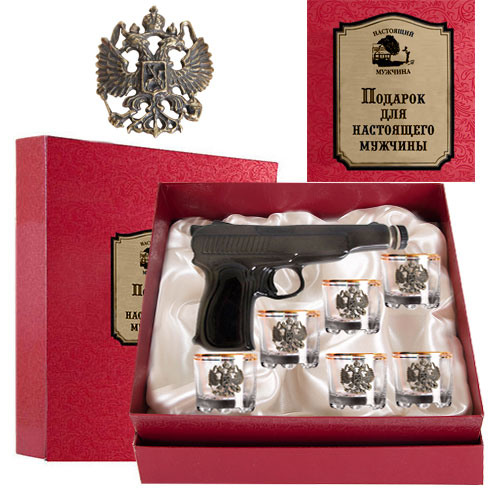 Набор штоф пистолет 6 стопок(низкие, золотая кайма) герб(латунь) к/к насто