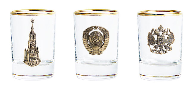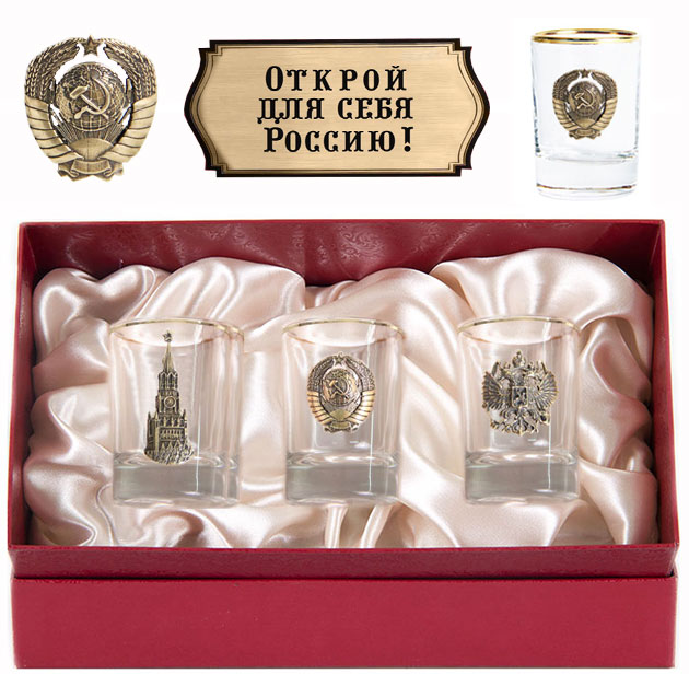 Набор из трех стопок с золотой отводкой(герб, кремль, ссср, латунь) в карт