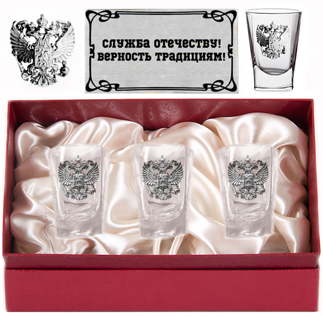 Набор из трех стопок с оловянными накладками(герб) в картонном футляре с н