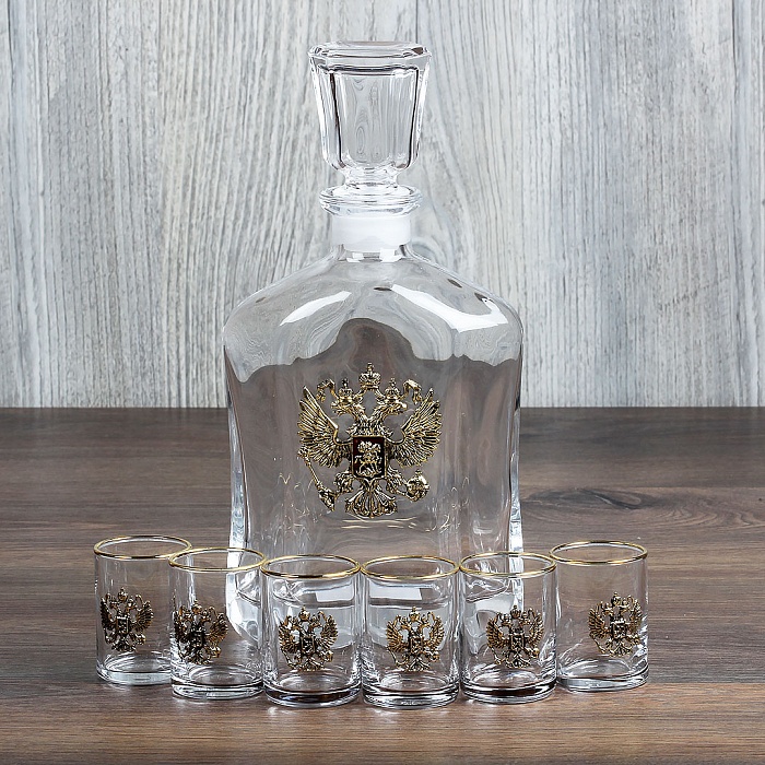 Набор штоф стекло с гербом 6 рюмок с золотой обводкой, латунь в к/к. Код товара: 050203220 Основной материал: стекло, олово, подарочная коробка из картона с шелковым ложементом Размер: Упаковка: 37*32*10 см Детали: в наборе штоф стекло и стопки для водки с латунной накладкой
