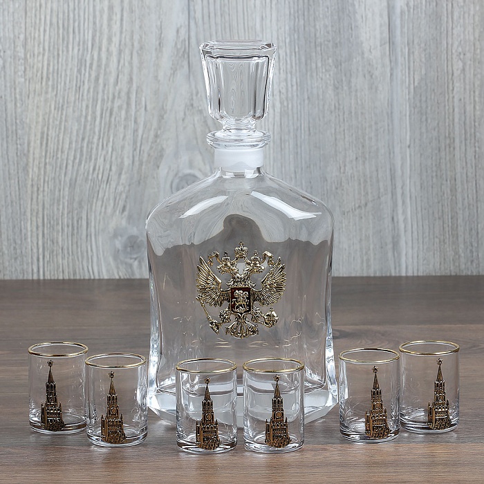 Набор штоф капитол с гербом + 6 рюмок с золотой обводкой спасская башня,