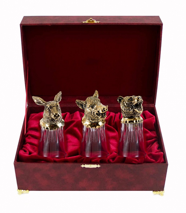 Набор стопок-перевертышей из трех штук заяц кабан медведь в шкатулке. Код товара: 050207015 Основной материал: Стопка: латунь, стекло Упаковка:дерево, иск. кожа, декоративная фурнитура, бархатный ложемент. Размер: Высота стопки 10см, диаметр стопки 5см Размер упаковке: 26,5х26,5х12см