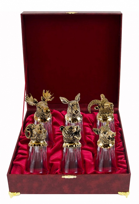 Набор стопок-перевертышей из шести штук в шкатулке. Код товара: 050207018 Основной материал: Стопка: латунь, стекло Упаковка:дерево, иск. кожа, декоративная фурнитура, бархатный ложемент. Размер: Высота стопки 10см, диаметр стопки 5см Размер упаковке: 26,5х26,5х12см