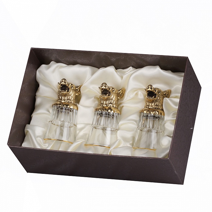 Набор стопок перевертышей 3 шт. кабан в к/к с накладкой. Код товара: 050207023/1 Основной материал: Стопка: латунь, стекло Упаковка:картонный футляр Размер: Высота стопки 10см, диаметр стопки 5см Размер упаковке: 25,5х17х10см
