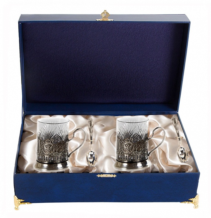 Набор никелированных подстаканников золотой дедушка и золотая бабушка в шк. Код товара: 050301005/1 Размер: Подстаканники: высота 13см; Размер футляра: 31*18,5*10,5см; Детали: В наборе: два подстаканника, два хрустальных стакана, две ложки.