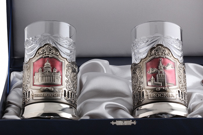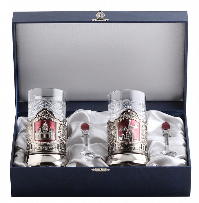 Набор никелированных подстаканников с эмалью две столицы санкт-петербург и. Код товара: 050301025/3 Основной материал: никелированный подстаканник с эмалью, хрустальный стакан, ложка из нерж. стали с эмалью Размер: Подарочная коробка: 30*10*18см Подстаканник со стаканом h13 Детали: в наборе: подстаканник, стакан из хрусталя, чайная ложка, подарочная коробка бумвинил с шелковым ложементом, вкладыш