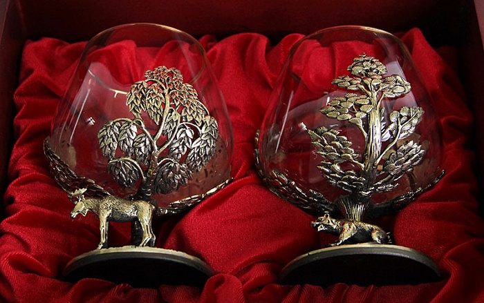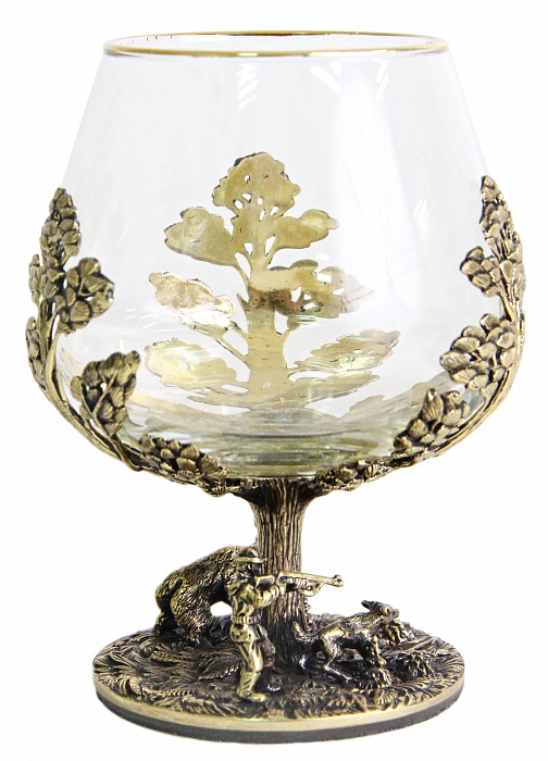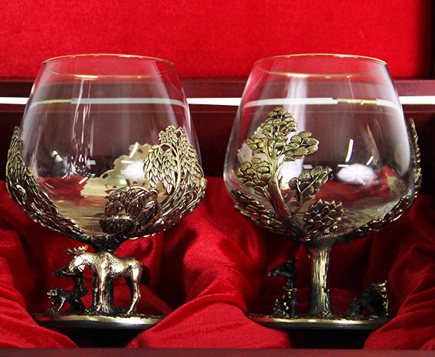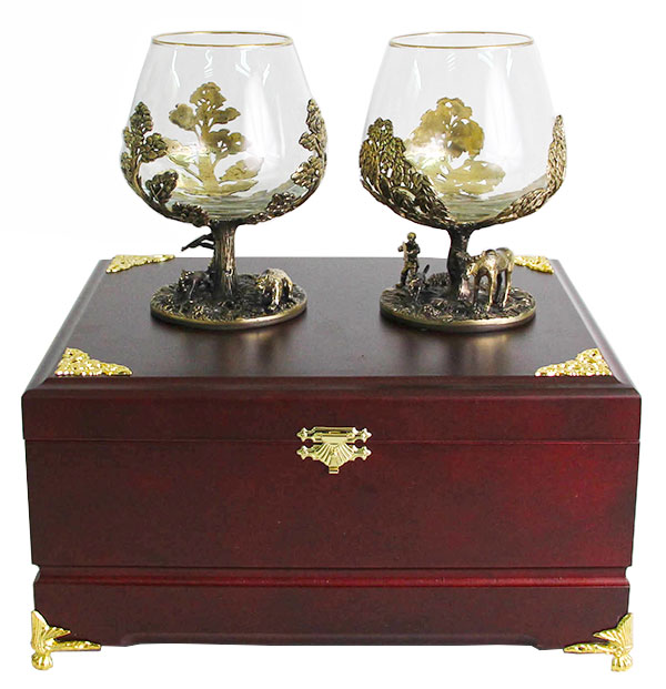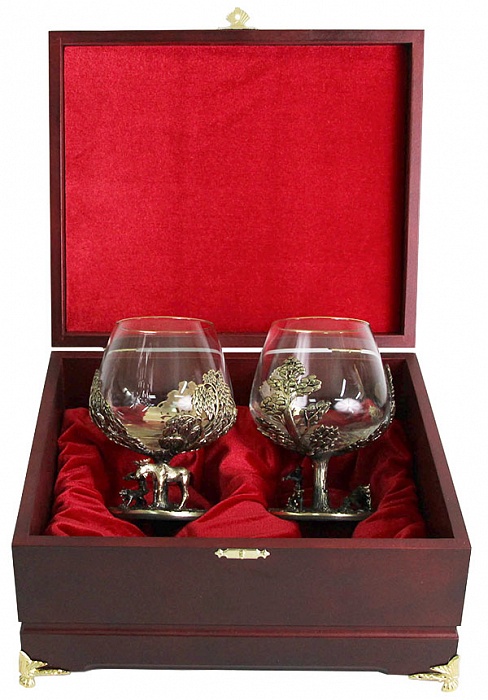 Набор бокалов для коньяка охота лось(береза) +медведь(сосна) деревянная шк