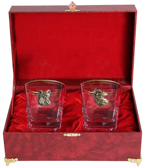 Набор из двух бокалов для виски звери кабан+лось(латунь) в шкатулке