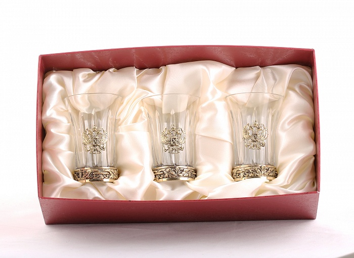 Набор стопок 3 шт с латунным основанием и накладкой герб(латунь) в коробк