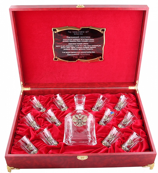Набор штоф капитол герб (латунь) и 12 стопок герб (латунь) латунное основ. Код товара: 050406017 Основной материал: стекло,латунь, шкатулка бумвинил, ложемент барахат Размер: Упаковка: 55х39,5х14,5см Детали: в наборе штоф стекло и стопки для водки