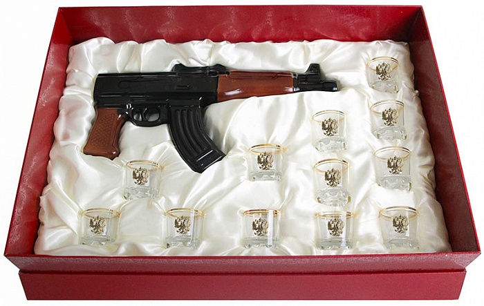 Набор со штофом автомат и 12 стопок (накладка герб латунь) большой картон