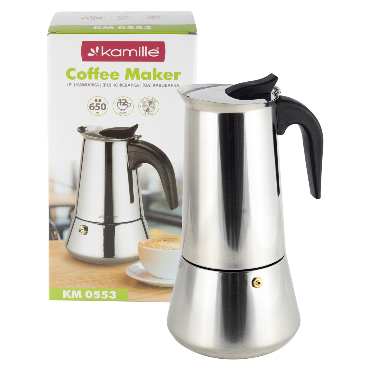 Кофеварка гейзерная из нержавеющей стали kamille km-0553 (600 мл. 12 порци. Бренд: Kamille Описание: Гейзерная кофеварка Kamille KM-0553 создана для приготовления великолепного кофе по современным итальянским технологиям. Используя ее на любых кухонных плитах (за исключением индукционных), за считанные минуты Вы сможете насладиться чашкой ароматного, хорошо проваренного кофе. Материал: нержавеющая сталь Материал ручки: бакелит Объем: 600 мл Количество порций: 12 Комплектация: нижняя емкость для воды емкость-фильтр для кофе фильтр силиконовое кольцо верхняя емкость Использование: Наполните нижнюю емкость водой, поместите сверху емкость-фильтр и наполните ее молотым кофе, не утрамбовывая его. Оденьте верхнюю секцию и прокрутите для закрытия. Убедитесь, что фильтр и силиконовое кольцо на месте и плотно прилегают друг к другу. Обратите внимание, что очень важно обеспечить таким образом полную герметичность. При приготовлении кофе уровень нагревания должен быть низким! Когда кофе перестанет поступать в верхнюю емкость, кофеварку необходимо убрать с нагревающей поверхности. Ароматный горячий кофе готов. Уход: После остывания кофеварки рекомендуется сразу раскрутить и вымыть ее при помощи небольшого количества моющего средства. Производить сборку только в сухом виде!
