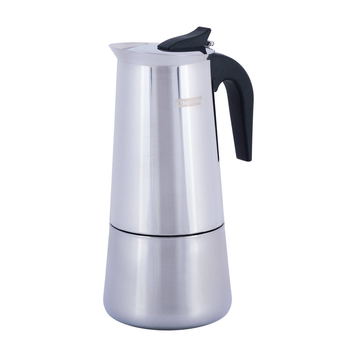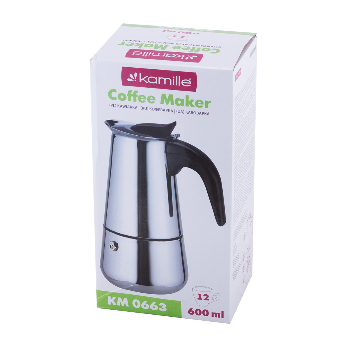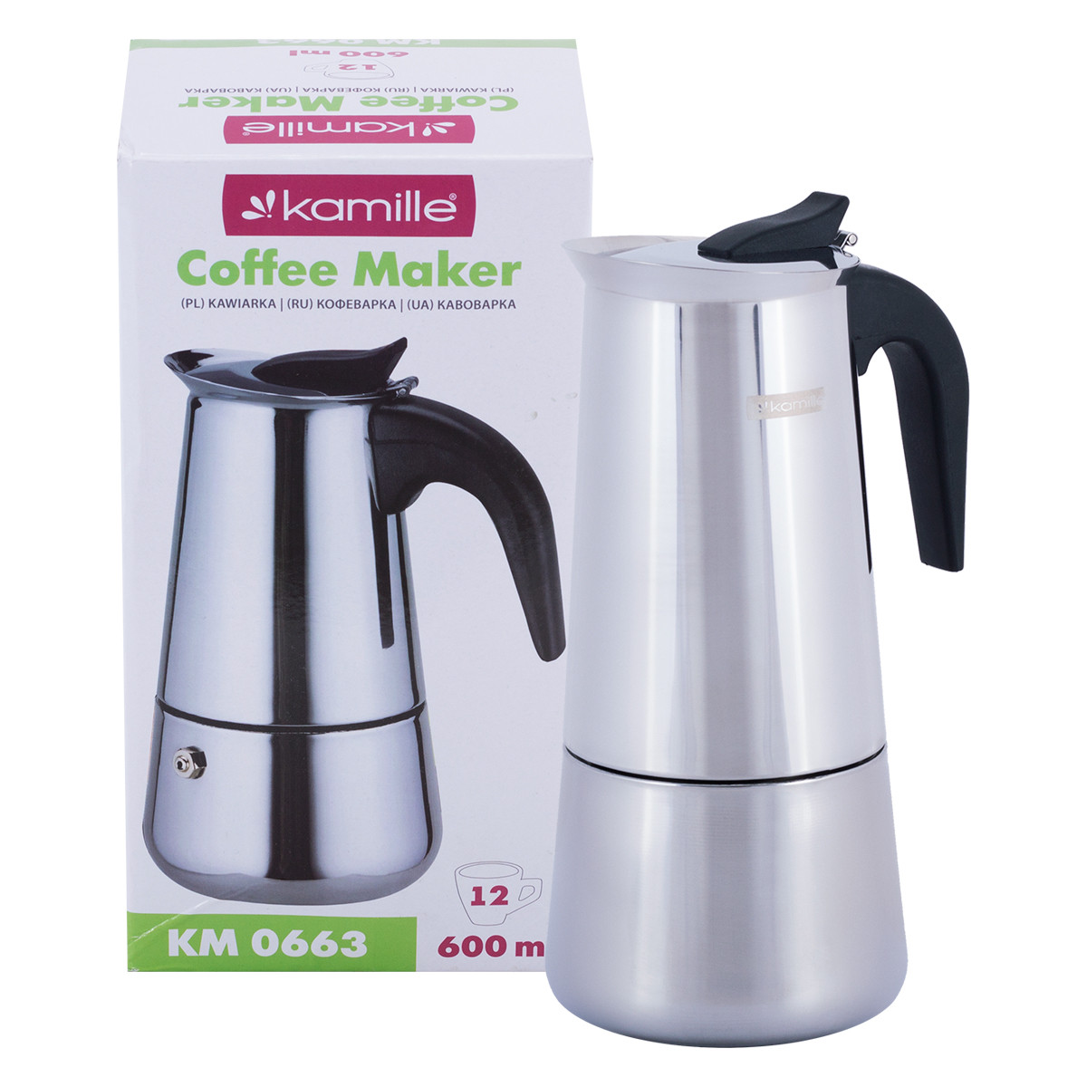 Кофеварка гейзерная из нержавеющей стали kamille km-0663 (600 мл. 12 порци. Бренд: Kamille Описание: Гейзерная кофеварка Kamille создана для приготовления великолепного кофе по современным итальянским технологиям. Используя ее на любых кухонных плитах (за исключением индукционных), за считанные минуты Вы сможете насладиться чашкой ароматного, хорошо проваренного кофе. Материал: нержавеющая сталь Материал ручки: бакелит Высота: 24,5 см Диаметр дна: 11,5 см Объем: 600 мл Количество порций: 12 Комплектация: нижняя емкость для воды емкость-фильтр для кофе фильтр силиконовое кольцо верхняя емкость Использование: Наполните нижнюю емкость водой, поместите сверху емкость-фильтр и наполните ее молотым кофе, не утрамбовывая его. Оденьте верхнюю секцию и прокрутите для закрытия. Убедитесь, что фильтр и силиконовое кольцо на месте и плотно прилегают друг к другу. Обратите внимание, что очень важно обеспечить таким образом полную герметичность. При приготовлении кофе уровень нагревания должен быть низким! Когда кофе перестанет поступать в верхнюю емкость, кофеварку необходимо убрать с нагревающей поверхности. Ароматный горячий кофе готов. Уход: После остывания кофеварки рекомендуется сразу раскрутить и вымыть ее при помощи небольшого количества моющего средства. Производить сборку только в сухом виде!