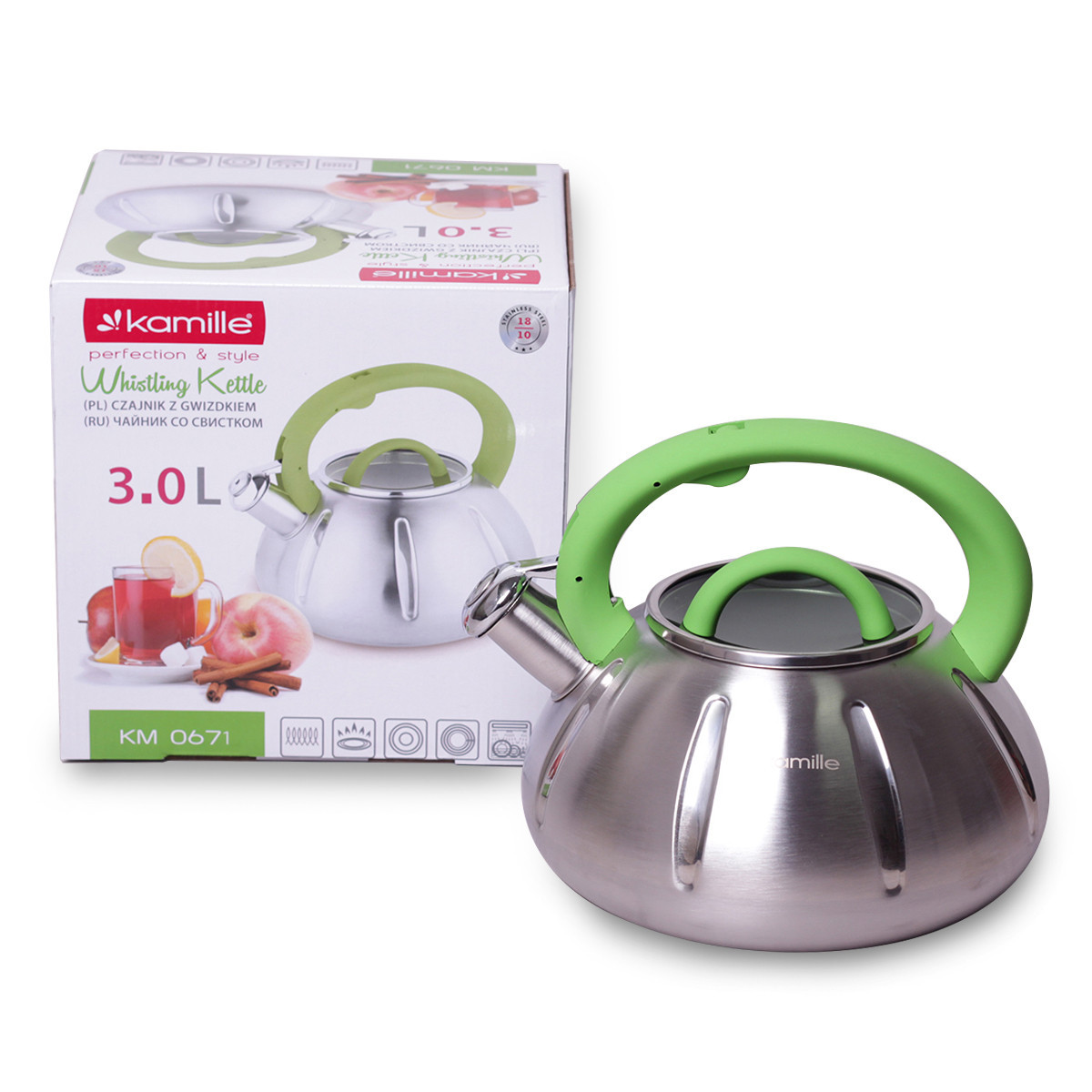Чайник kamille 3л из нержавеющей стали со свистком и стеклянной крышкой. Бренд: Kamille Описание: Процесс чаепития давно прочно вошел в жизнь каждого человека во всем мире. И для того, чтобы приготовить ароматный чай, необходимо первым делом вскипятить воду. По сути, подогреть воду можно в любой кухонной посудине, но от вкуса воды зависит и вкус напитка, поэтому лучше использовать специально выделенную для этих целей посуду, а именно — чайники Kamille. Чайники Kamille изготовлены из высококачественных материалов с использованием новейших технологий производства, благодаря чему они подходят для интенсивного ежедневного использования, а их эстетичный внешний вид непременно подойдет к дизайну Вашей кухни. Материал: нержавеющая сталь Материал крышки: жаропрочное стекло Материал ручки: бакелит с покрытием "soft-touch" Тип ручки: фиксированная Общий объем: 3л Варианты цветов ручки: синий, светлое дерево, салатовый Особенности: стильный современный дизайн высокая надежность и устойчивость к царапинам внешняя поверхность с сатиновой полировкой ручка с покрытием "soft-touch" утолщенное индукционное дно удобный и прочный механизм открывания свистка Использование: на индукционной плите на стекло-керамической плите на электрической плите на газовой плите в посудомоечной машине