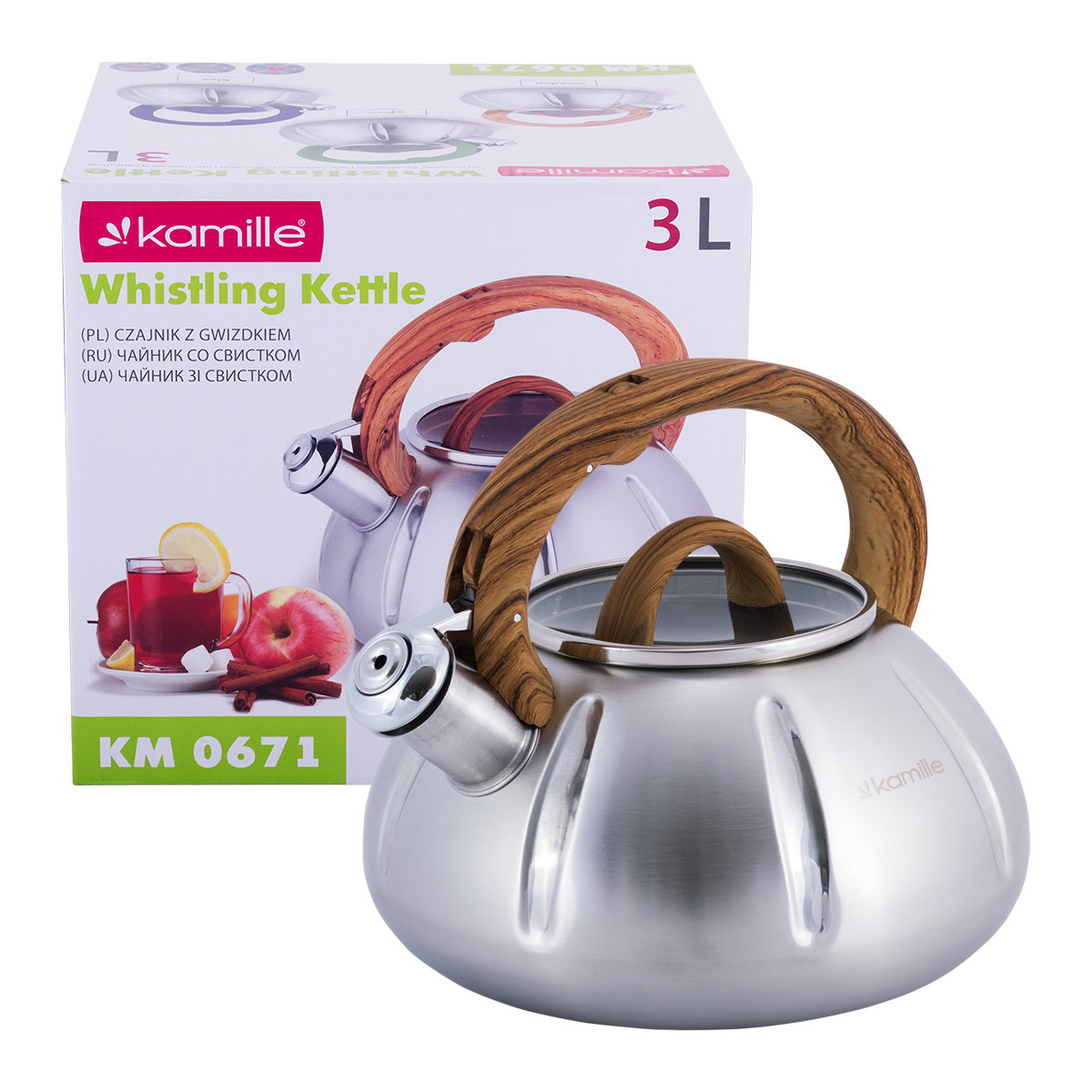 Чайник kamille дерево 3л из нержавеющей стали со свистком и стеклянной кры. Бренд: Kamille Описание: Процесс чаепития давно прочно вошел в жизнь каждого человека во всем мире. И для того, чтобы приготовить ароматный чай, необходимо первым делом вскипятить воду. По сути, подогреть воду можно в любой кухонной посудине, но от вкуса воды зависит и вкус напитка, поэтому лучше использовать специально выделенную для этих целей посуду, а именно — чайники Kamille. Чайники Kamille изготовлены из высококачественных материалов с использованием новейших технологий производства, благодаря чему они подходят для интенсивного ежедневного использования, а их эстетичный внешний вид непременно подойдет к дизайну Вашей кухни. Материал: нержавеющая сталь Материал крышки: жаропрочное стекло Материал ручки: бакелит с покрытием "soft-touch" Тип ручки: фиксированная Общий объем: 3л Варианты цветов ручки: синий, светлое дерево, салатовый Особенности: стильный современный дизайн высокая надежность и устойчивость к царапинам внешняя поверхность с сатиновой полировкой ручка с покрытием "soft-touch" утолщенное индукционное дно удобный и прочный механизм открывания свистка Использование: на индукционной плите на стекло-керамической плите на электрической плите на газовой плите в посудомоечной машине