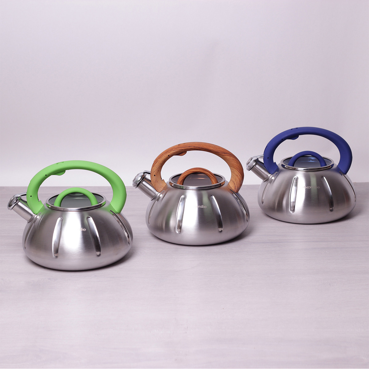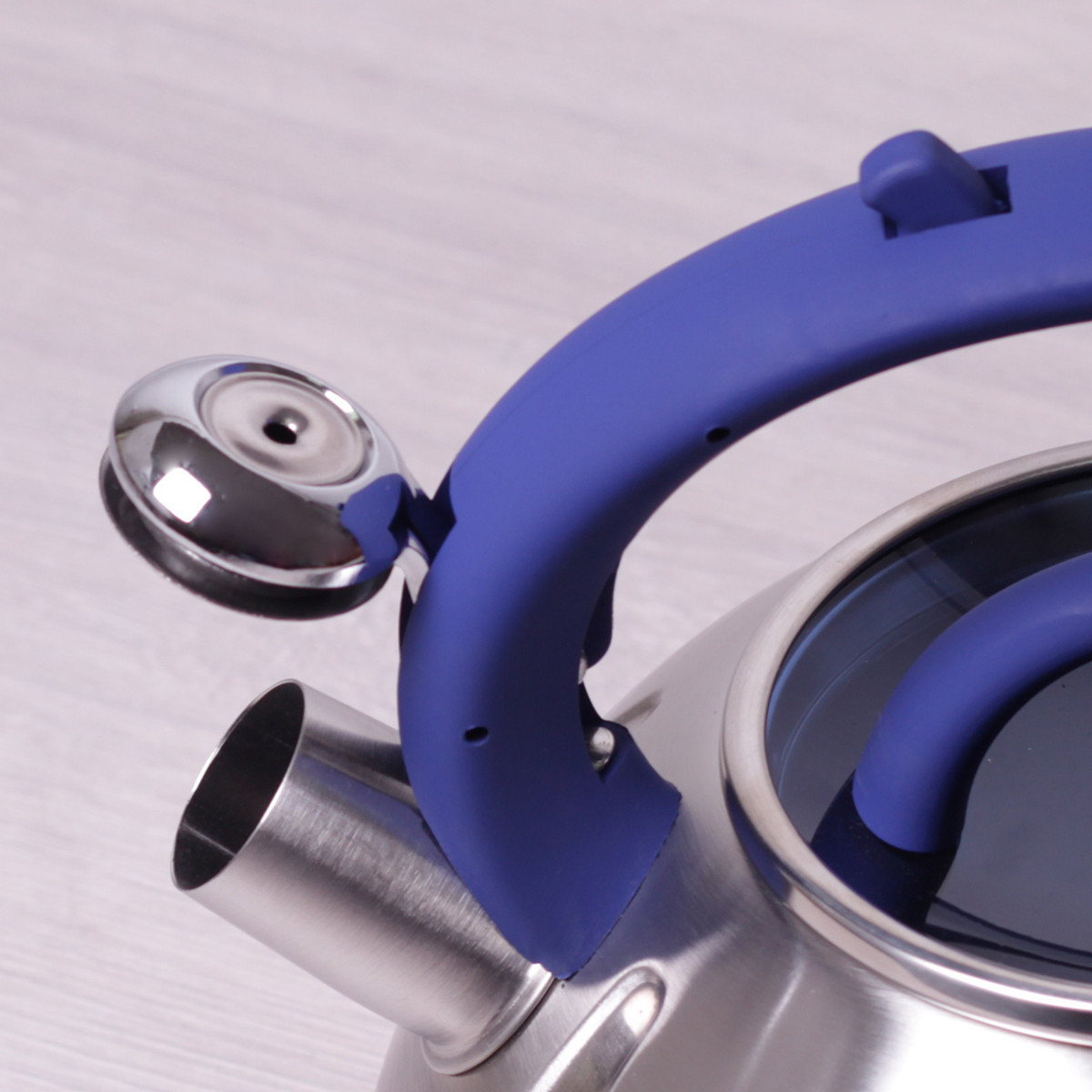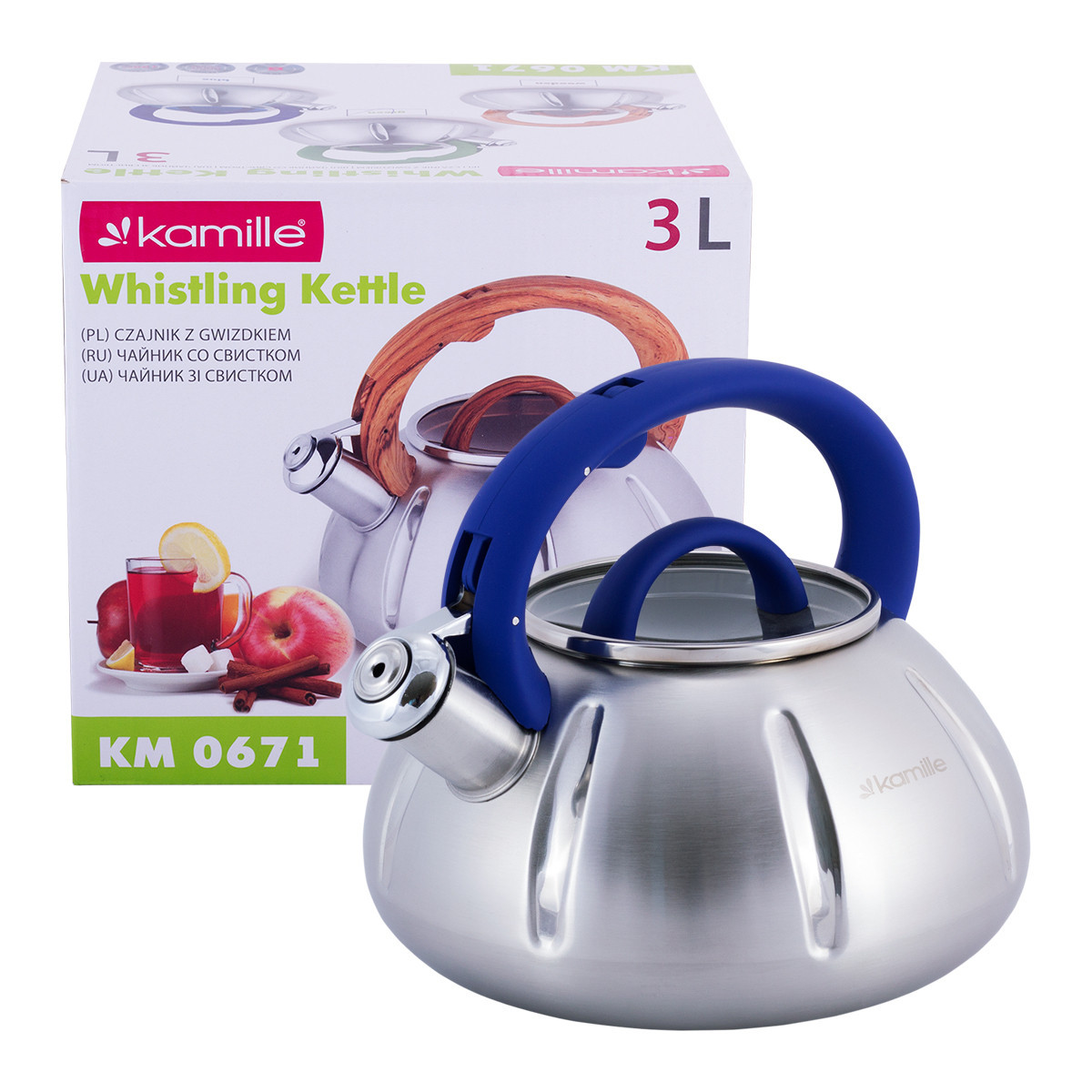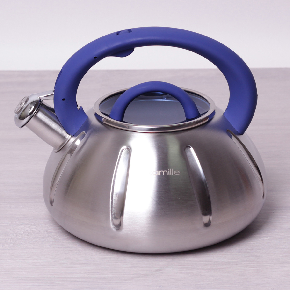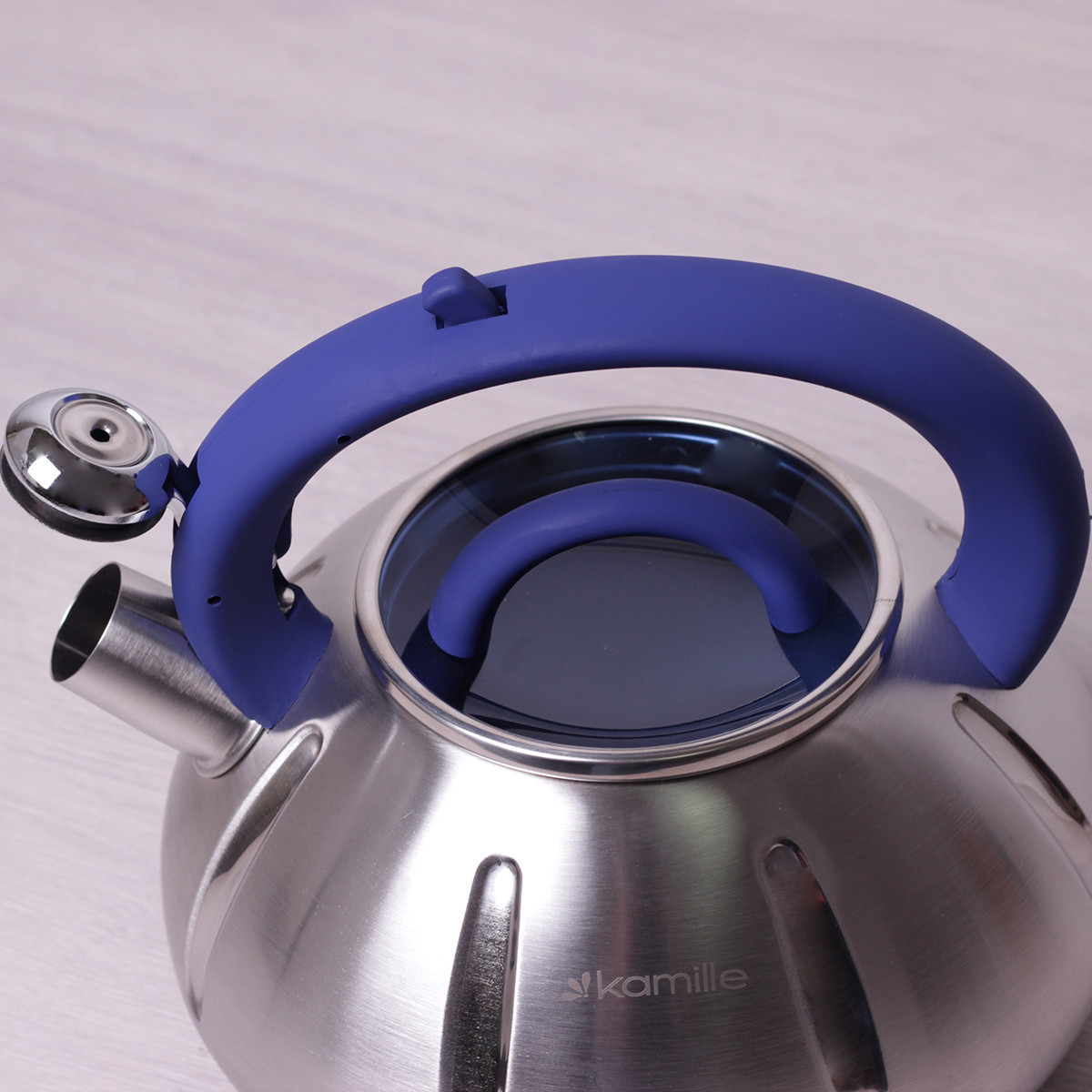 Чайник kamille синий 3л из нержавеющей стали со свистком и стеклянной крыш. Бренд: Kamille Описание: Процесс чаепития давно прочно вошел в жизнь каждого человека во всем мире. И для того, чтобы приготовить ароматный чай, необходимо первым делом вскипятить воду. По сути, подогреть воду можно в любой кухонной посудине, но от вкуса воды зависит и вкус напитка, поэтому лучше использовать специально выделенную для этих целей посуду, а именно — чайники Kamille. Чайники Kamille изготовлены из высококачественных материалов с использованием новейших технологий производства, благодаря чему они подходят для интенсивного ежедневного использования, а их эстетичный внешний вид непременно подойдет к дизайну Вашей кухни. Материал: нержавеющая сталь Материал крышки: жаропрочное стекло Материал ручки: бакелит с покрытием "soft-touch" Тип ручки: фиксированная Общий объем: 3л Варианты цветов ручки: синий, светлое дерево, салатовый Особенности: стильный современный дизайн высокая надежность и устойчивость к царапинам внешняя поверхность с сатиновой полировкой ручка с покрытием "soft-touch" утолщенное индукционное дно удобный и прочный механизм открывания свистка Использование: на индукционной плите на стекло-керамической плите на электрической плите на газовой плите в посудомоечной машине