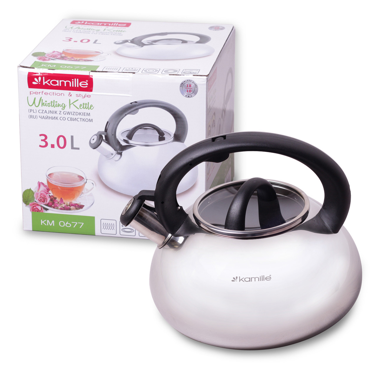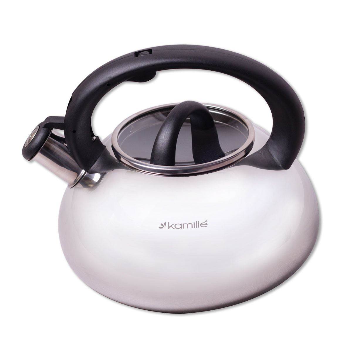 Чайник kamille 3л из нержавеющей стали со свистком и стеклянной крышкой. Бренд: Kamille Описание: Процесс чаепития давно прочно вошел в жизнь каждого человека во всем мире. И для того, чтобы приготовить ароматный чай, необходимо первым делом вскипятить воду. По сути, подогреть воду можно в любой кухонной посудине, но от вкуса воды зависит и вкус напитка, поэтому лучше использовать специально выделенную для этих целей посуду, а именно — чайники Kamille. Чайники Kamille изготовлены из высококачественных материалов с использованием новейших технологий производства, благодаря чему они подходят для интенсивного ежедневного использования, а их эстетичный внешний вид непременно подойдет к дизайну Вашей кухни. Материал: нержавеющая сталь Материал крышки: жаропрочное стекло Материал ручки: бакелит Тип ручки: фиксированная Общий объем: 3л Цвет ручки: черный Особенности: стильный современный дизайн высокая надежность и устойчивость к царапинам внешняя поверхность с зеркальной полировкой утолщенное индукционное дно удобный и прочный механизм открывания свистка Использование: на индукционной плите на стекло-керамической плите на электрической плите на газовой плите в посудомоечной машине