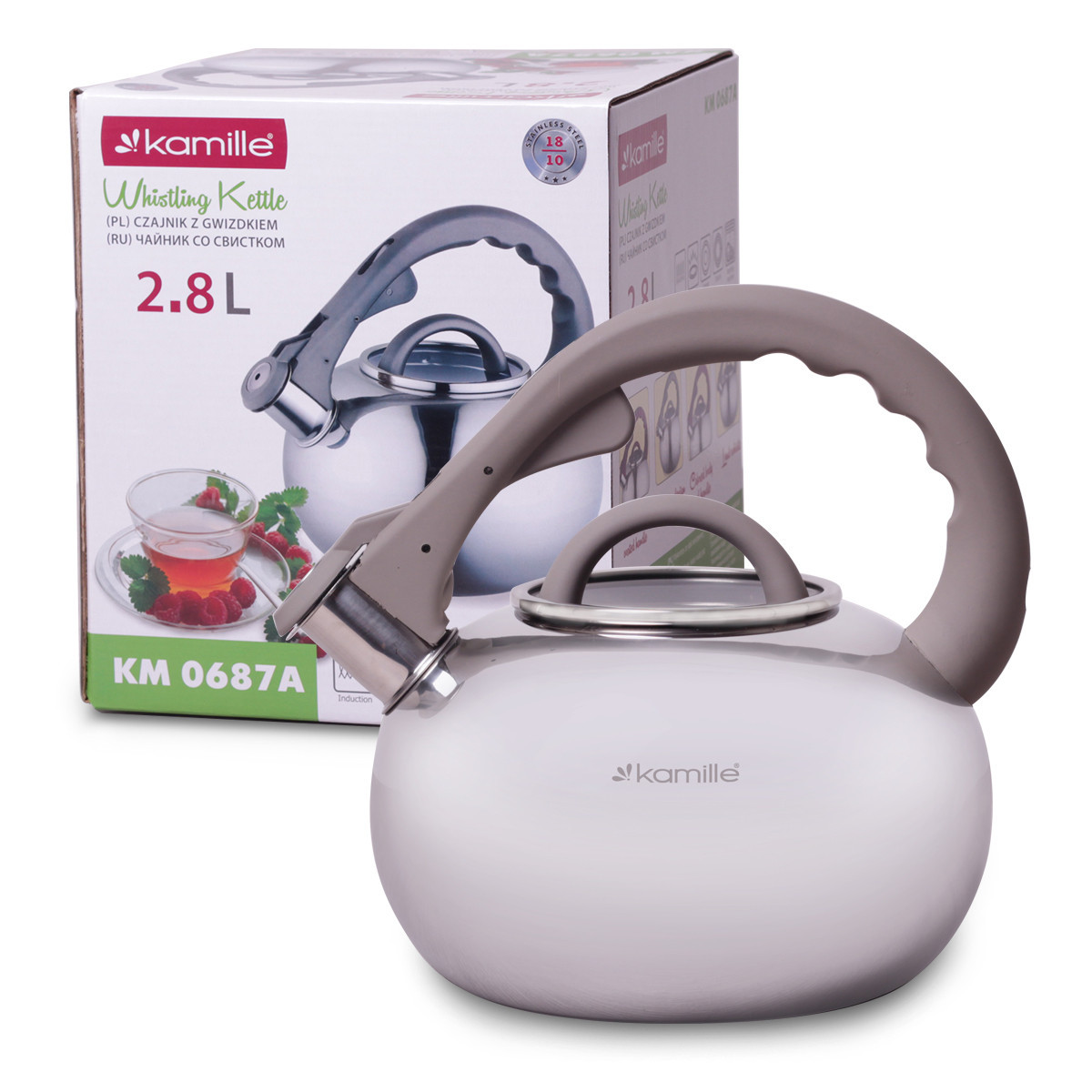 Чайник kamille 2.8л из нержавеющей стали со свистком и стеклянной крышкой. Бренд: Kamille Описание: Процесс чаепития давно прочно вошел в жизнь каждого человека во всем мире. И для того, чтобы приготовить ароматный чай, необходимо первым делом вскипятить воду. По сути, подогреть воду можно в любой кухонной посудине, но от вкуса воды зависит и вкус напитка, поэтому лучше использовать специально выделенную для этих целей посуду, а именно — чайники Kamille. Чайники Kamille изготовлены из высококачественных материалов с использованием новейших технологий производства, благодаря чему они подходят для интенсивного ежедневного использования, а их эстетичный внешний вид непременно подойдет к дизайну Вашей кухни. Материал: нержавеющая сталь Материал крышки: жаропрочное стекло Материал ручки: бакелит с покрытием "soft-touch" Тип ручки: фиксированная Общий объем: 2.8л Варианты цветов ручки: серый, фиолетовый Особенности: стильный современный дизайн высокая надежность и устойчивость к царапинам внешняя поверхность с зеркальной полировкой бакелитовая ручка с покрытием "soft-touch" утолщенное индукционное дно удобный и прочный механизм открывания свистка Использование: на индукционной плите на стекло-керамической плите на электрической плите на газовой плите в посудомоечной машине