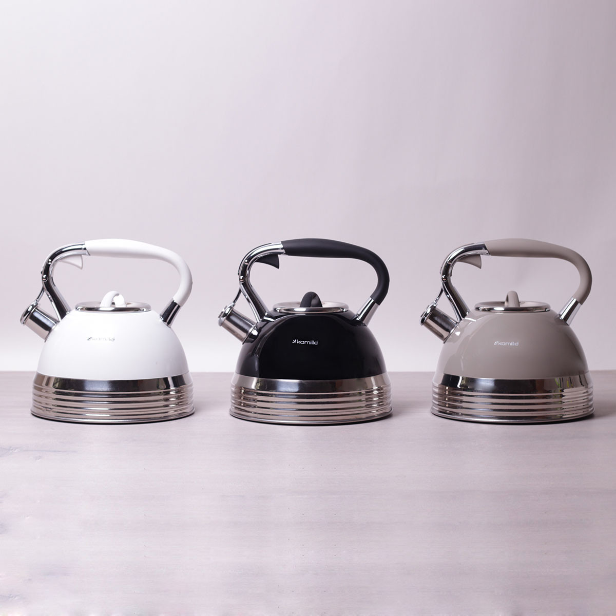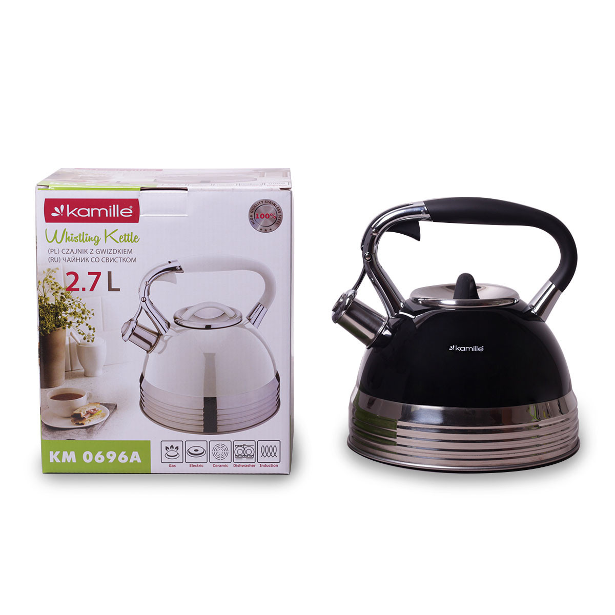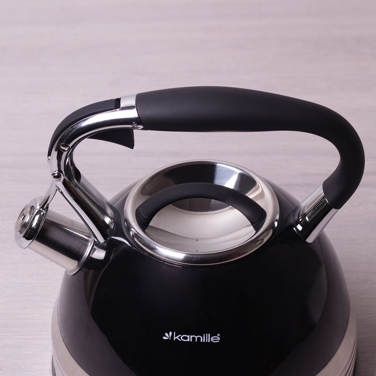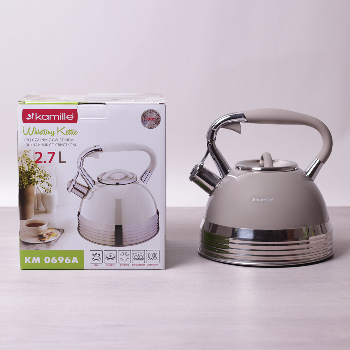 Чайник 2.7л из нержавеющей стали со свистком и ручкой с покрытием soft-tou. Бренд: Kamille Описание: Процесс чаепития давно прочно вошел в жизнь каждого человека во всем мире. И для того, чтобы приготовить ароматный чай, необходимо первым делом вскипятить воду. По сути, подогреть воду можно в любой кухонной посудине, но от вкуса воды зависит и вкус напитка, поэтому лучше использовать специально выделенную для этих целей посуду, а именно — чайники Kamille. Чайник Kamille изготовлены из высококачественных материалов с использованием новейших технологий производства, благодаря чему они подходят для интенсивного ежедневного использования, а их эстетичный внешний вид непременно подойдет к дизайну Вашей кухни. Материал: нержавеющая сталь. Материал крышки: нержавеющая сталь. Цвета чайника: белый, бежевый, чёрный. Общий объем: 2.7л. Тип ручки: фиксированная. Материал ручки: бакелит с покрытием soft-touch. Цвет ручки: белый, бежевый, чёрный. Свисток: есть. Полировка металла: сатиновая. Подходит для индукционных плит: да. Подходит для мытья в посудомоечной машине: да. Особенности: стильный современный дизайн высокая надежность и устойчивость к царапинам утолщенное индукционное дно удобный и прочный механизм открывания свистка Использование: на индукционной плите на стекло-керамической плите на электрической плите на газовой плите в посудомоечной машине