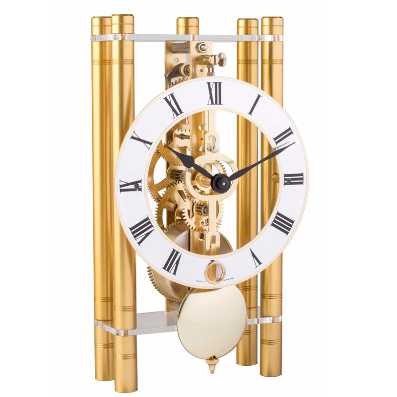Настольные механические часы 0721-05-020. Интерьерные механические часы Hermle 0721-05-020 Немецкая компания Hermle специализируется на производстве интерьерных часов. На сегодняшний день, успешно работает и cостовляет достойную конкуренцию на мировом часовом рынке, благодаря высокому качеству сборки, точностью и красотой исполнения. Механические настольные скелетонизированные часы с ручным заводом. Колонночки изготовлены из анодированного аллюминия. Минеральное стекло. Механизм латунный. Бой один удар каждый ровный час. Запас хода 8 дней Характеристики Hermle 0721-05-020 Размер: 19.5х11х6 см Механизм: механика. Материал: металл, стекло Производство: Германия