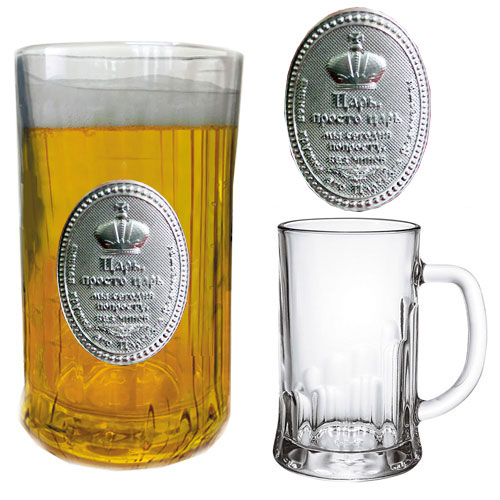 Кружка пивная с оловянной накладкой царская. Код товара: 080301054 Основной материал: Стекло, Олово Размер: 15,5*8,7 см. Детали: Объем 0,5 литра. Без упаковки.